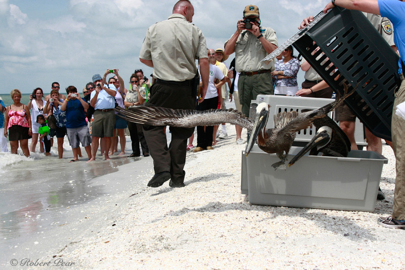 Birds are often sent to C.R.O.W. (Clinic for the Rehabilitation of Wildlife) on Sanibel Island near Fort Myers, Florida after being taken in for an injury of one sort or another. In these photos a group of rehabilitated pelicans are being released after it was decided that Sanibel was the best area to reintroduce them back into the wild.